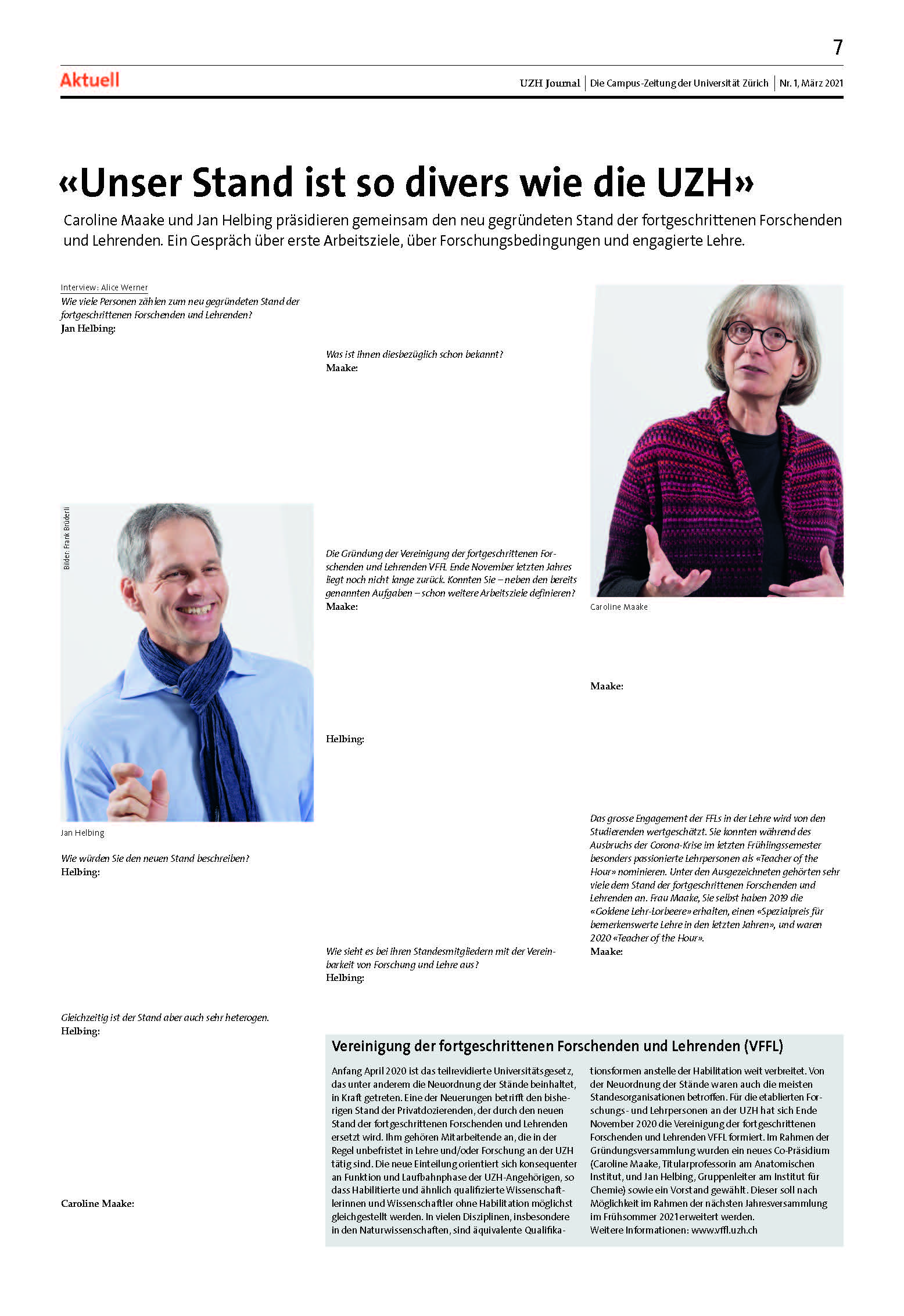 Nach der Konstituierung der Vereinigung der Fortgeschrittenen Forschenden und Lehrenden (VFFL) im Herbst 2020 konnte das Co-Präsidium der VFFL in der Ausgabe 1/21 des UZH Journals den neuen Stand einem breiteren Publikum vorstellen. Das PDF der Ausgabe finden Sie hier (PDF, 15 MB).